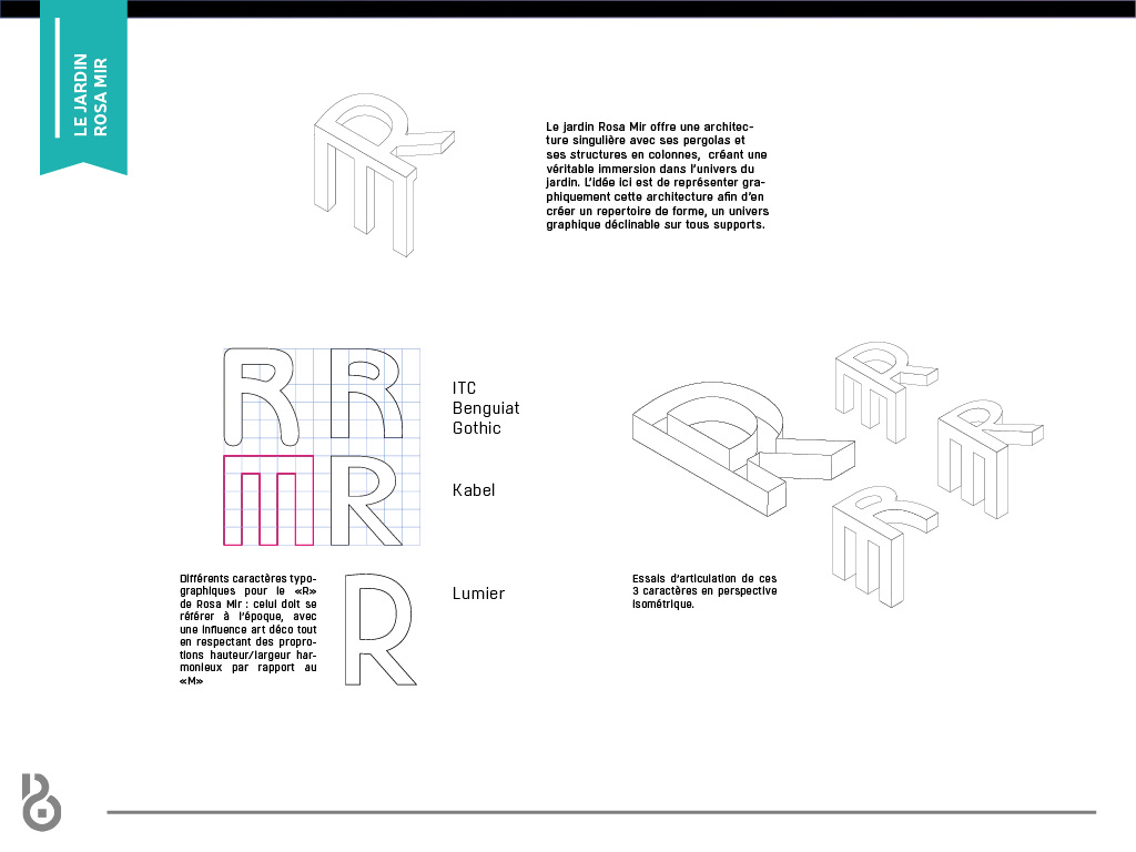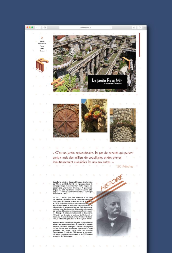Identité visuelle et webdesign du Jardin Rosa Mir à Lyon. L’identité se base sur l’architecture particulière du jardin, composée essentiellement de structures superposées et entrecoupées les unes aux autres.